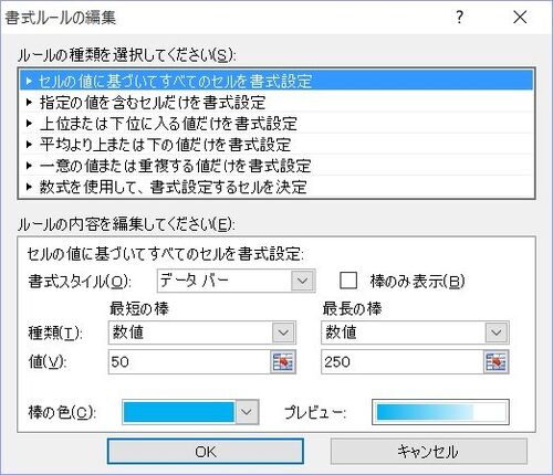 ■ Excel2007演習問題集 Lesson47 「条件付き書式で、降水量の大小関係を水色のデータバーを使って表示する 条件付き書式 結果演習問題集どおりで、全く問題ない‥‥ はずだが、最短の棒を「数値,50」としたのに、6行目(降水量 47.0)に棒が表示されるのはお…