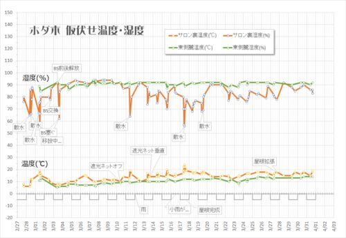 3月4日のグラフにその後のデータを追加した。 仮伏せ場所が落ち着いたせいか、温度・湿度とも落ち着いてきた。 但し、温度が低め(たぶん)なのが気になる。しかし‥‥ 5℃上げる手段がわからない‥‥ 高めよりはいいはずなので、しばらくは様子見‥‥ 日付の変わり…