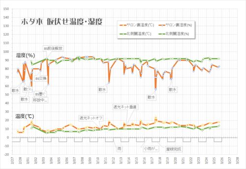 ホダ場の整備、今日は午後からの出であったが、Tシャツ1枚で枯れた竹を小切りにした‥‥ 仮伏せ内の温度・湿度、定期的に観ている訳ではないが、安定しており(たぶん)、観測が疎かになっている状態‥‥