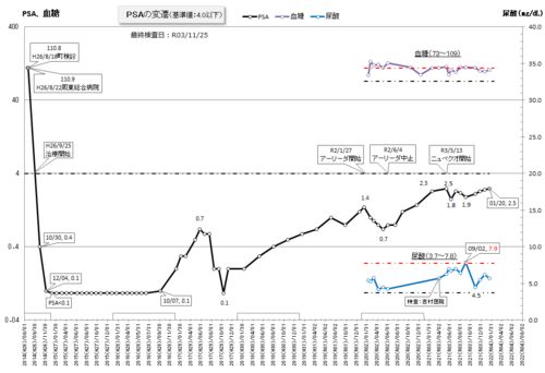 泌尿器科 PSAは 2.5で漸増傾向にあるが、このまま様子を見ることにした。 尿酸は、ビールを焼酎に変えた以降、基準値内であり、このまま続けようと思う... 外科 12月9日に受けた下肢静脈瘤手術の経過検査、問題なく今日で終了となった。 なお、手術後として…