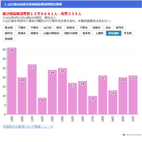 中国新聞デジタル より引用 山口県で21日、新たに3122人の新型コロナウイルス感染が確認された。先週の同じ曜日に比べ537人増えた。60~90代の男女9人が亡くなり、死者は計282人になった。 グラフで見る 山口県の直近の新規感染者数の推移 田布施町の新型コ…