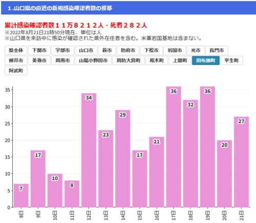 中国新聞デジタル より引用 山口県で21日、新たに3122人の新型コロナウイルス感染が確認された。先週の同じ曜日に比べ537人増えた。60~90代の男女9人が亡くなり、死者は計282人になった。 グラフで見る 山口県の直近の新規感染者数の推移 田布施町の新型コ…