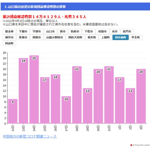 中国新聞デジタル より引用 山口県で21日、新たに3122人の新型コロナウイルス感染が確認された。先週の同じ曜日に比べ537人増えた。60~90代の男女9人が亡くなり、死者は計282人になった。 グラフで見る 山口県の直近の新規感染者数の推移 田布施町の新型コ…