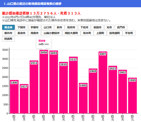 山口県で27日、新たに1965人の新型コロナウイルス感染が確認された。先週の同じ曜日に比べて870人減った。70~90代の男女5人が亡くなり、死者は計313人となった。