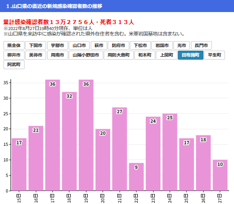 新たな感染者の居住地は下関市445人、宇部市305人、山口市271人、周南市223人、岩国市174人、防府市156人、山陽小野田市87人、下松市63人、長門市43人、光市41人、萩市40人、美祢市33人、柳井市23人、和木町20人、周防大島町11人、田布施町10人、福岡県4人、平生町と広島県、熊本県が各3人、上関町と阿武町、島根県、栃木県、東京都、滋賀県、高知県が各1人。周南市、下関市、萩市の高齢者施設や医療機関などで計6件のクラスター(感染者集団)が発生した。