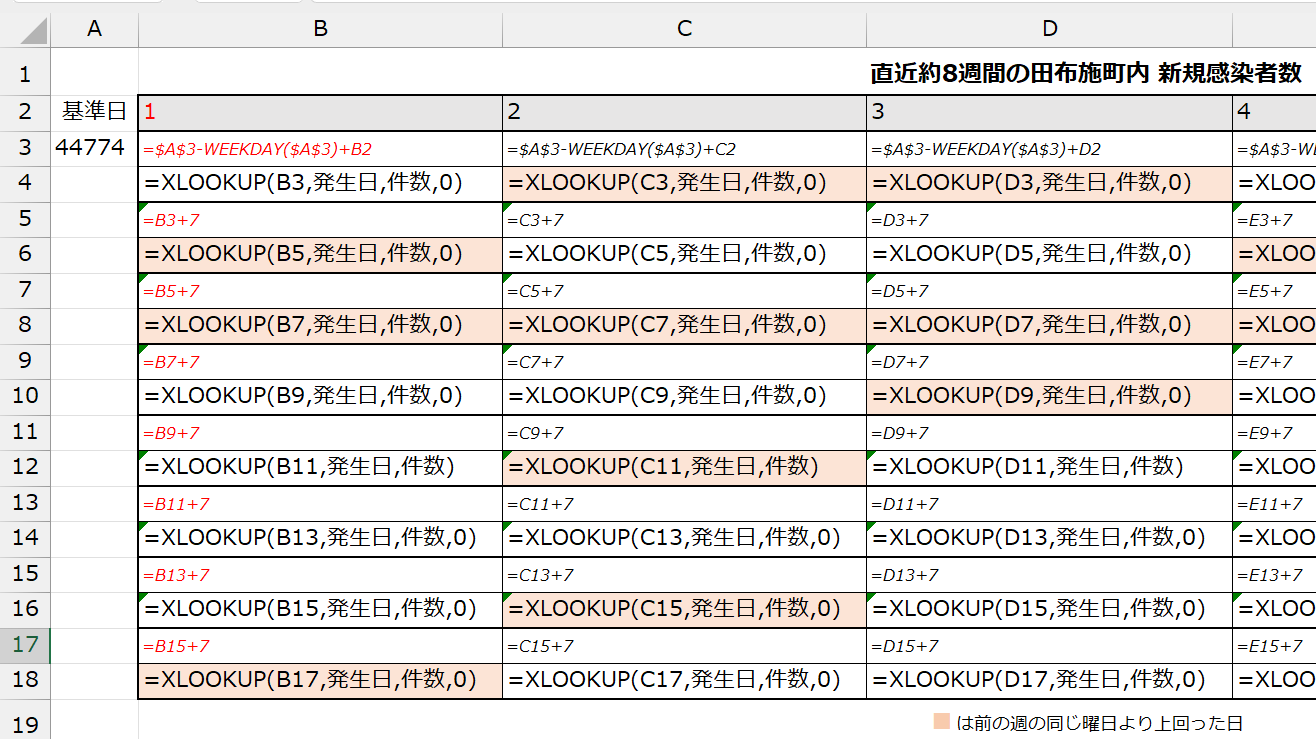 感染者数が「前の週の同じ曜日」より上回った日が判るようにセルに色を付ける処理。