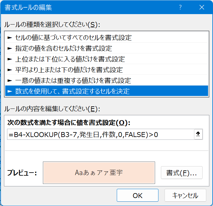 - 書式ルールの編集に戻ったら、[OK]で閉じる。